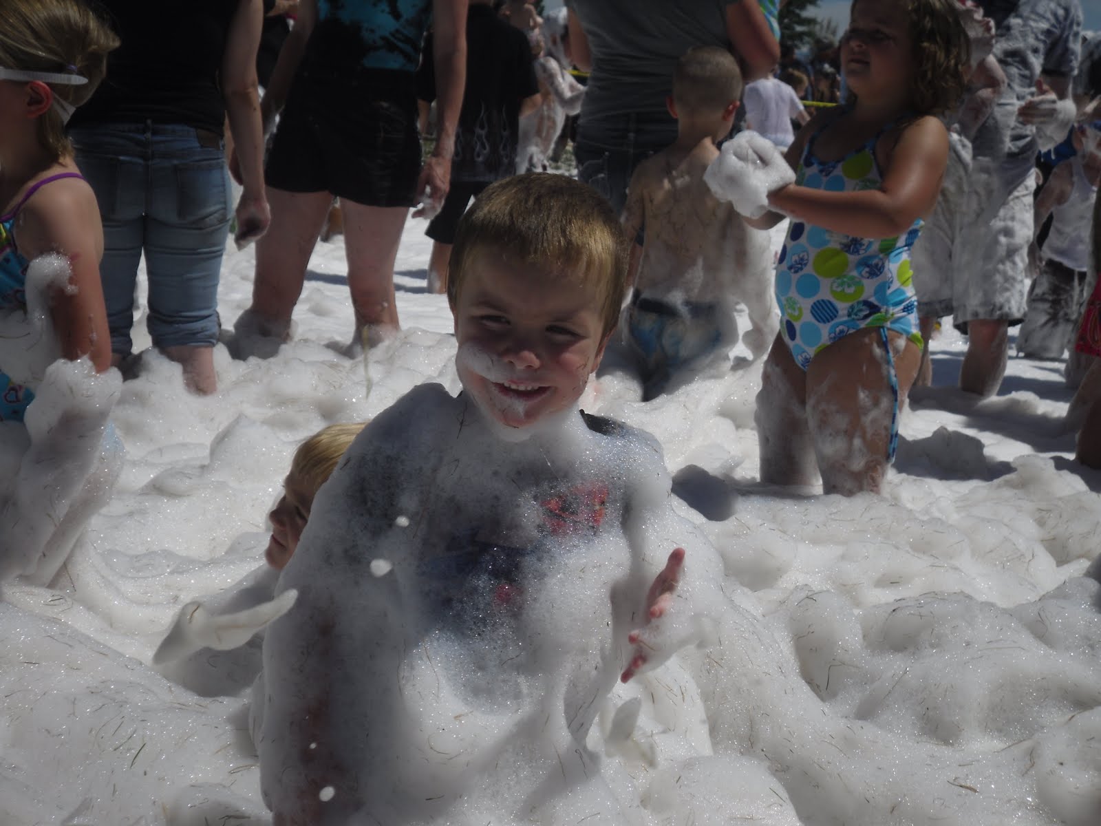Getting cleaned off with a fire hose. In case you are wondering, Foam Day is a service our local fire department does for the kids, they spray tons of flame retardant foam (just foamy soap really) out and the kids play in it. Then they wash them off and give out free watermelon. A silly fun, and free event, yeah!